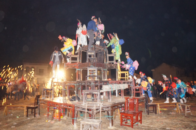 表演開場(chǎng)時(shí),領(lǐng)鞭人于頂層倒立,腿蹬三下,而后響鞭四方以敬諸神。鞭落,一群旗帆、竹馬吉語(yǔ)吶喊,圍桌跑圈。隨即,三聲鞭響,鑼鼓齊鳴,領(lǐng)獅人引獅從四角涌上,斗技爭(zhēng)霸,好戲正式開場(chǎng)。