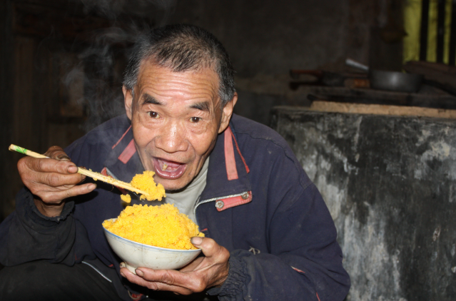 鎮(zhèn)坪鹽背子飯散粒金黃,雖然沒(méi)油沒(méi)鹽,但吃起來(lái)不噎不膩,清香爽口,沒(méi)有一點(diǎn)粗糙之感,在路途上存放時(shí)間長(zhǎng),是背鹽人耐餓、耐渴的理想食品。