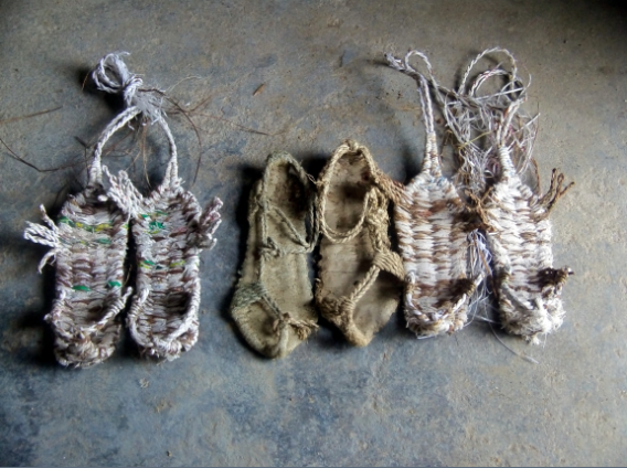 其制作過(guò)程如下:選取當(dāng)?shù)爻赡贶诼?,刮掉外皮,晾干備用(也有用棕絲、龍須草、構(gòu)樹(shù)皮、稻草、舊布條);搓好繩子,掛到草鞋耙子上編織;編織成鞋的樣子,再上好鞋耳子,穿好左右兩只即可穿用。