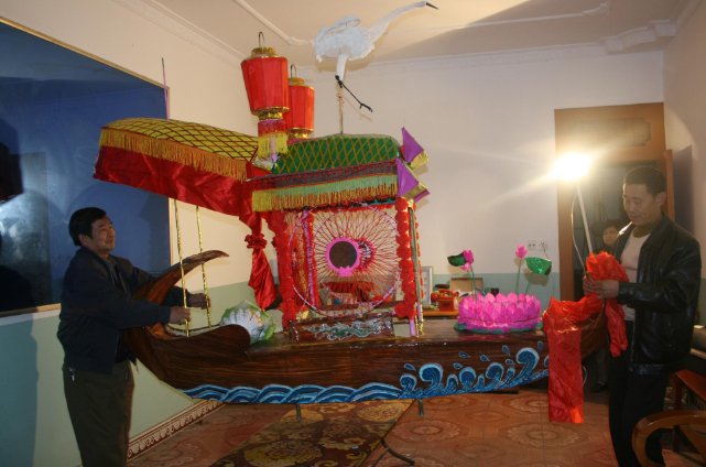 紙?jiān)破窂挠猛旧峡煞譃楣?jié)慶裝飾和喪葬祭祀兩大類。用于節(jié)慶裝飾的紙?jiān)胁书T(mén)、戲臺(tái)、店鋪門(mén)面裝潢、匾額、人物、紙馬、戲文、舞具、風(fēng)箏、各式紙燈、采蓮船、紙花等;用于喪俗祭祀的紙?jiān)屑埲恕⒓堮R、搖錢樹(shù)、靈棚、金山銀山、牌坊、門(mén)樓、宅院、家禽、童男童女、亭臺(tái)樓閣、仙鶴、車、轎、花卉、河燈、花圈等吊掛祭祀焚燒的紙品。