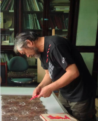 制作藍印花布的工藝流程很復雜。首先從蓼藍草中提取藍作染料(靛藍),把鏤空花版鋪在白布上,用刮漿板把防染漿劑刮入花紋空隙漏印在布面上,干后放入染缸,將布放入缸中浸染20分鐘,而后取出氧化、透風30分鐘,一般經(jīng)過6至8次反復染色,直到達到所需顏色為止。再將其拿出,放在空氣中氧化,晾干后刮去防染漿粉,即顯現(xiàn)出藍白花紋。因為是全手工印染,干后的漿不免會有裂紋,形成手工藍印花布特有的魅力——冰裂紋。