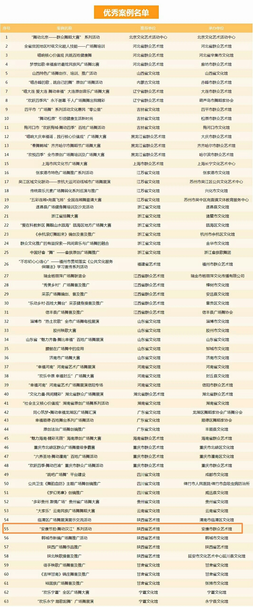 8月7日,由文化部全國(guó)公共文化發(fā)展中心、中國(guó)文化館協(xié)會(huì)聯(lián)合開展的“歡躍四季”百姓廣場(chǎng)舞普及推廣活動(dòng)案例征集工作正式公布入選廣場(chǎng)舞名單,由安康市群眾藝術(shù)館舞蹈干部創(chuàng)作的《安康節(jié)拍》廣場(chǎng)舞入選全國(guó)優(yōu)秀案例。