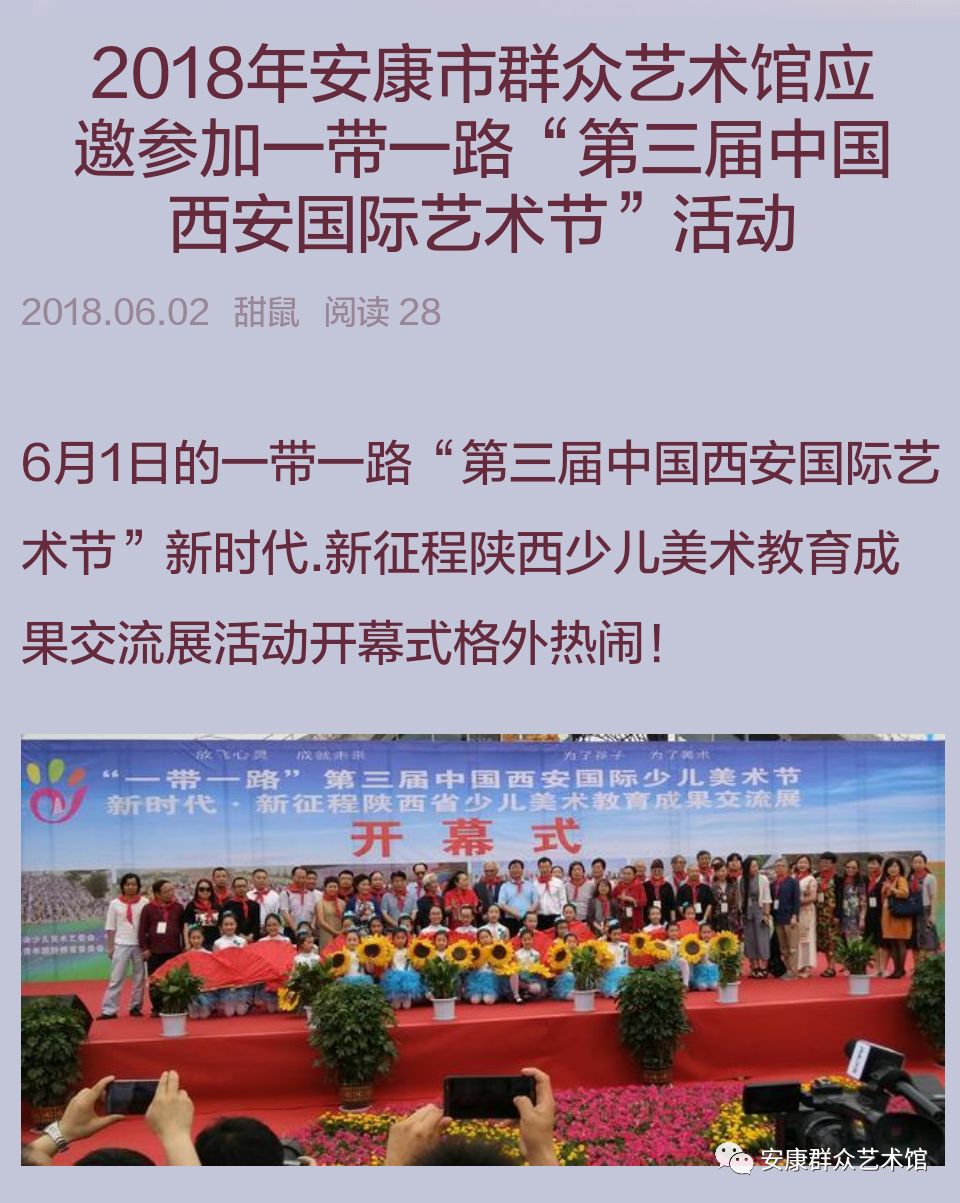 童年是初生的綠葉,童年是含苞的花蕾,童年是一片藍(lán)藍(lán)的天,童年是充滿美麗的夢(mèng)幻。六月一日上午,“一帶一路”第三屆中國(guó)西安國(guó)際少兒美術(shù)節(jié)在西安國(guó)際美術(shù)城拉開(kāi)帷幕。安康市群眾藝術(shù)館派出馬孟剛和劉曉東二位美術(shù)干部參加了此次少兒美術(shù)教育成果交流展。今天小編刊發(fā)劉曉東老師所發(fā)美篇截圖,帶給大家不一樣的精彩!