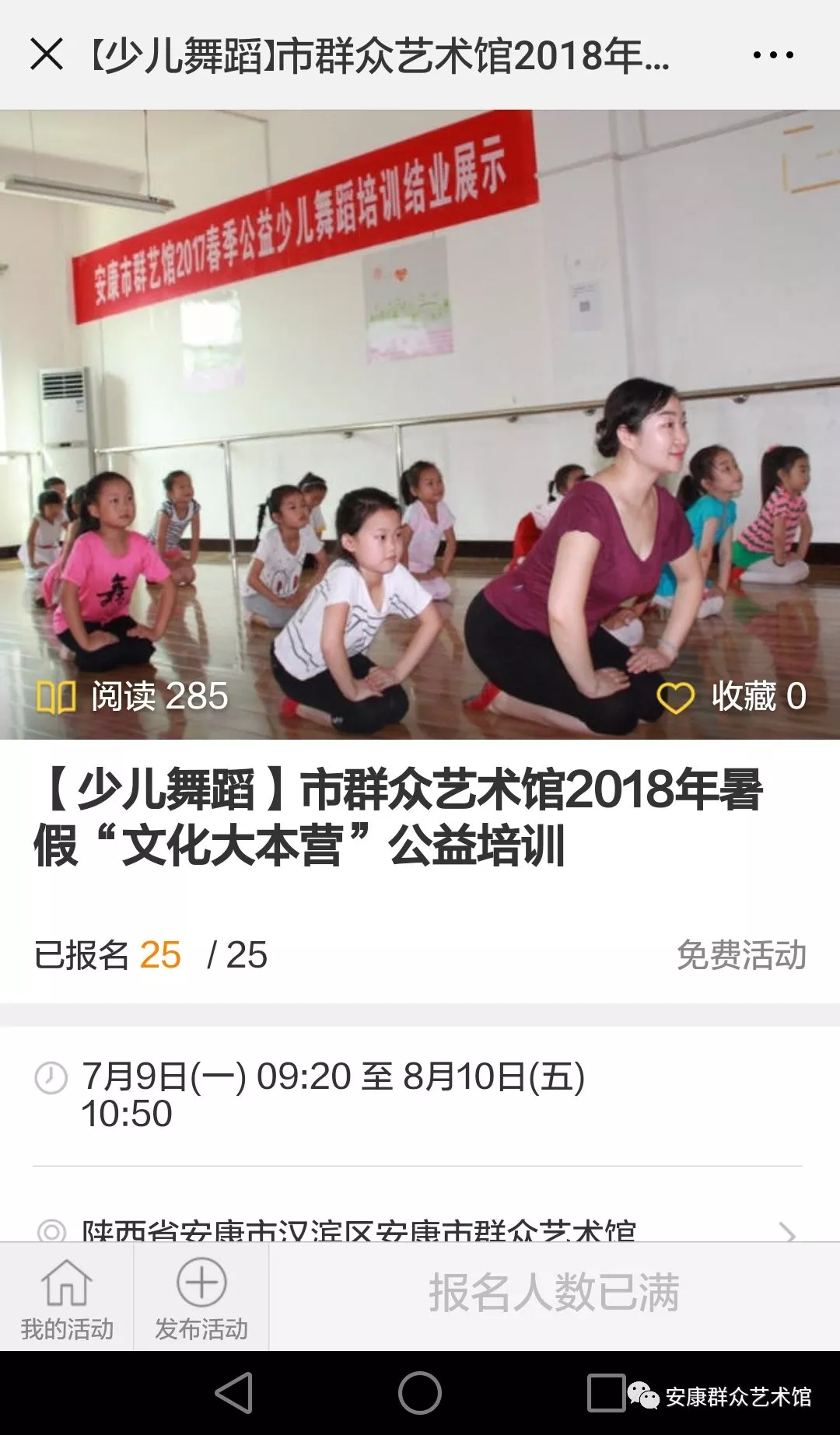 據(jù)悉,為進一步弘揚中華民族傳統(tǒng)文化,豐富青少年的暑期生活,深入推進安康中心城區(qū)“文化大本營”工程實施,進一步提升群藝館免費開放服務(wù)質(zhì)量水平,滿足群眾多樣化的文化需求,安康市群眾藝術(shù)館從7月9日至8月10日的開辦少兒舞蹈、少兒美術(shù)、少兒書法、少兒吉他、少兒國際標準舞、少兒歌手、少兒拉丁舞公益培訓(xùn)。此次培訓(xùn)受到轄區(qū)群眾熱捧,在報名系統(tǒng)開通一小時后,各培訓(xùn)班均因名額滿員自動關(guān)閉報名系統(tǒng)。