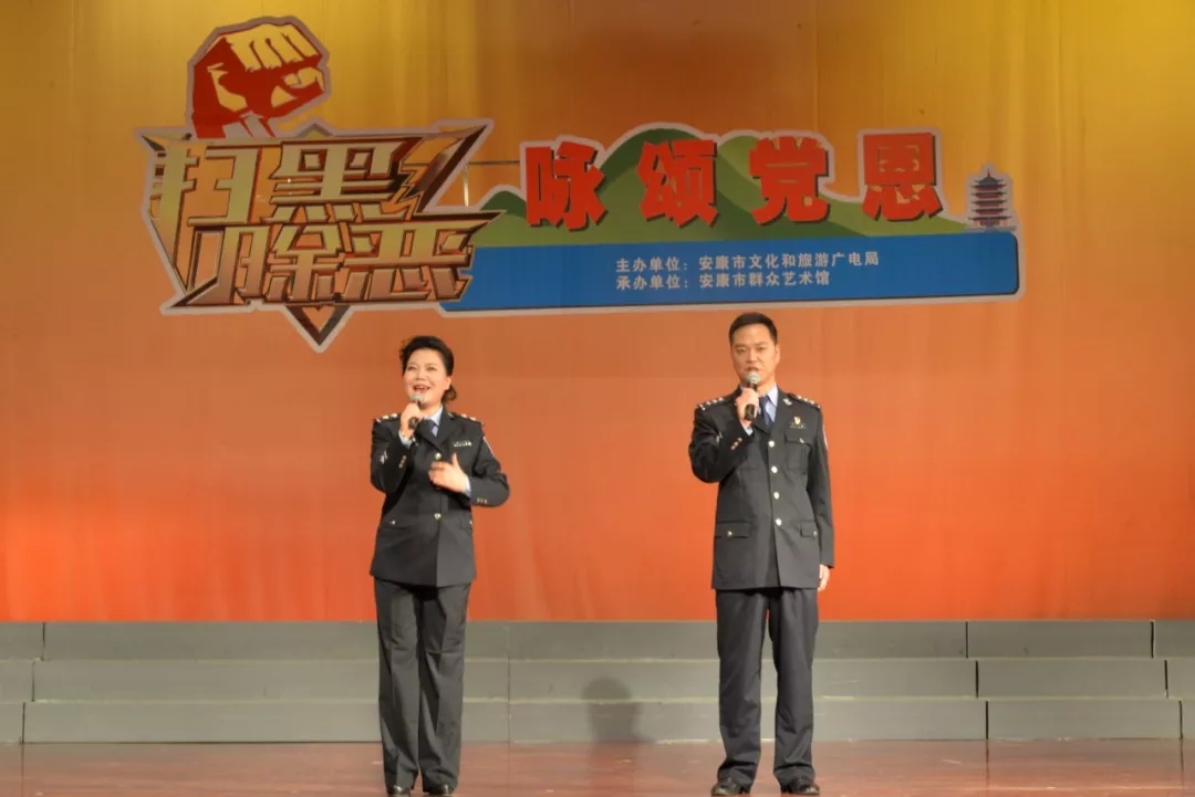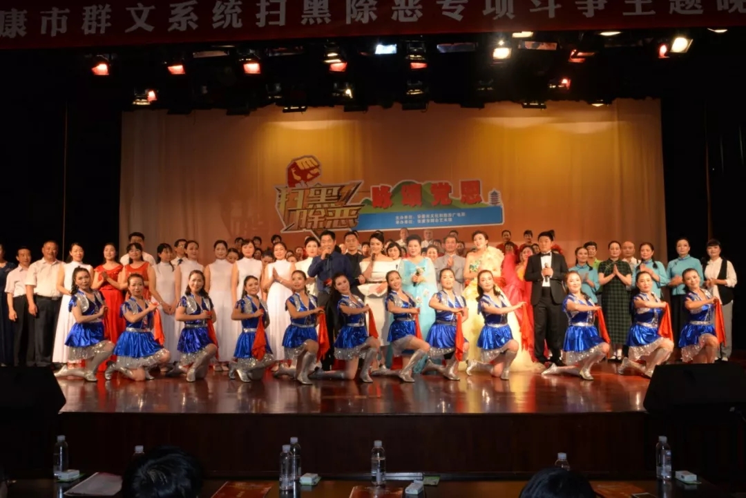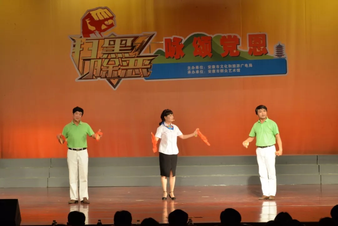 2019年6月25日晚上19:30,由安康市文化和旅游廣電局主辦,安康市群眾藝術(shù)館承辦,安康市曲藝家協(xié)會(huì)、安康南楓民間歌舞團(tuán)、安康博閱學(xué)社、安康水電總廠“舞之戀”藝術(shù)團(tuán)等單位協(xié)辦的市直群文系統(tǒng)“掃黑除惡專項(xiàng)斗爭(zhēng)”主題晚會(huì)又在安康市群眾藝術(shù)館劇場(chǎng)隆重上演,這也是安康中心城區(qū)2019年第一場(chǎng)以“掃黑除惡”為主題的專題晚會(huì)。安康市文化和旅游廣電局黨組書記、局長(zhǎng)楊海波,安康市紀(jì)委常委、安康市監(jiān)委委員、市委巡查組組長(zhǎng)方賢超,安康市委政法委副書記、市掃黑辦副主任朱定新,安康市法學(xué)會(huì)專職副會(huì)長(zhǎng)、市掃黑辦副主任謝賢梅,市掃黑辦副主任曹修斌;安康市文化和旅游廣電局副局長(zhǎng)王軍,安康市文化和旅游廣電局副局長(zhǎng)劉璇,安康市群眾藝術(shù)館館長(zhǎng)周墻等相關(guān)部門領(lǐng)導(dǎo)出席晚會(huì)并和數(shù)百位社會(huì)各界群眾一起觀看了演出。