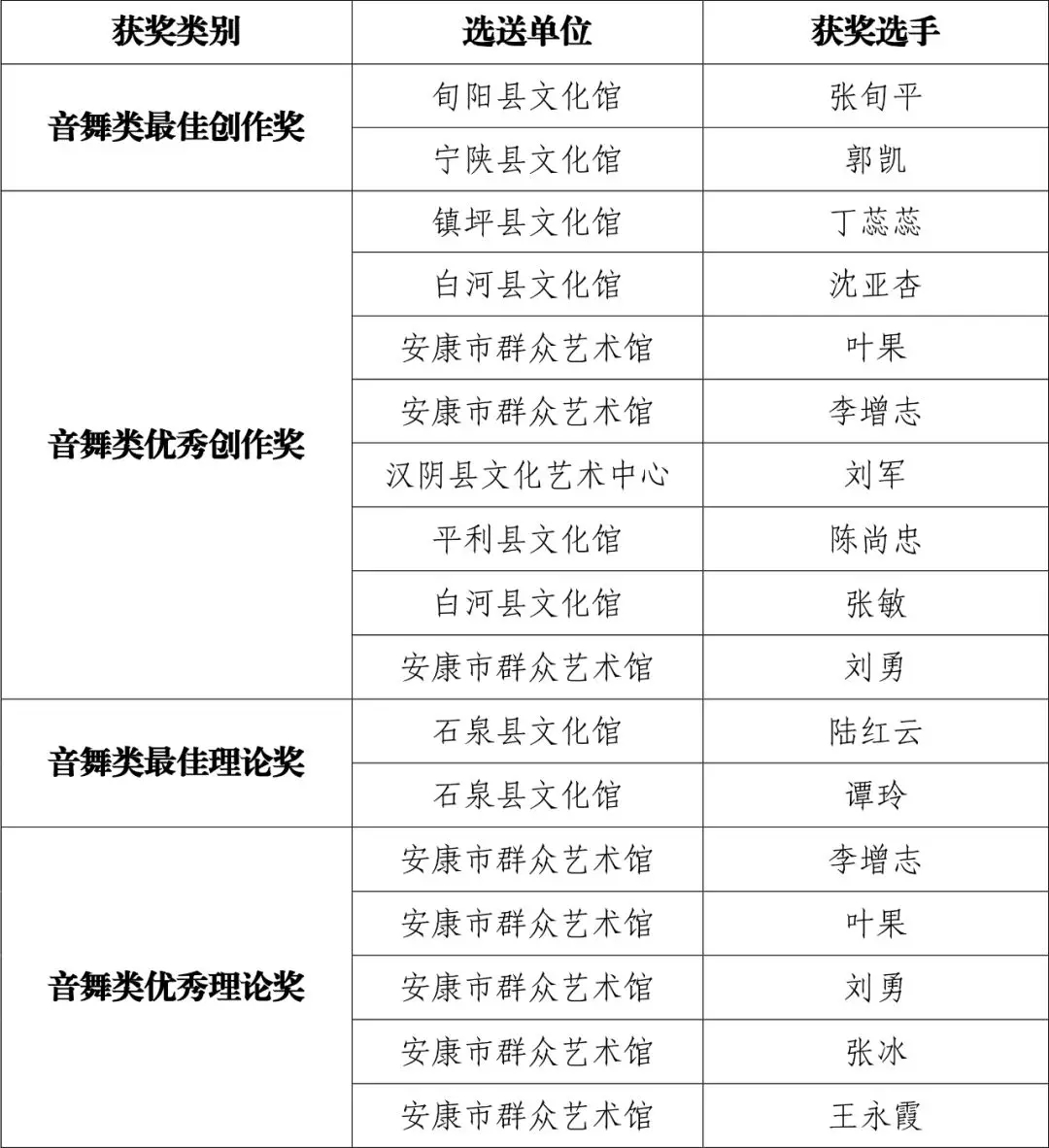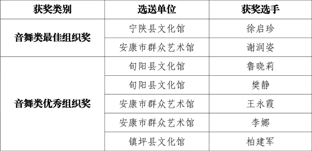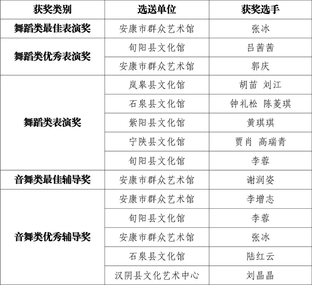 現(xiàn)將群星風采·第六屆陜西省群文系統(tǒng)業(yè)務干部技能大賽安康選拔賽(音舞類)比賽結果公布如下:
